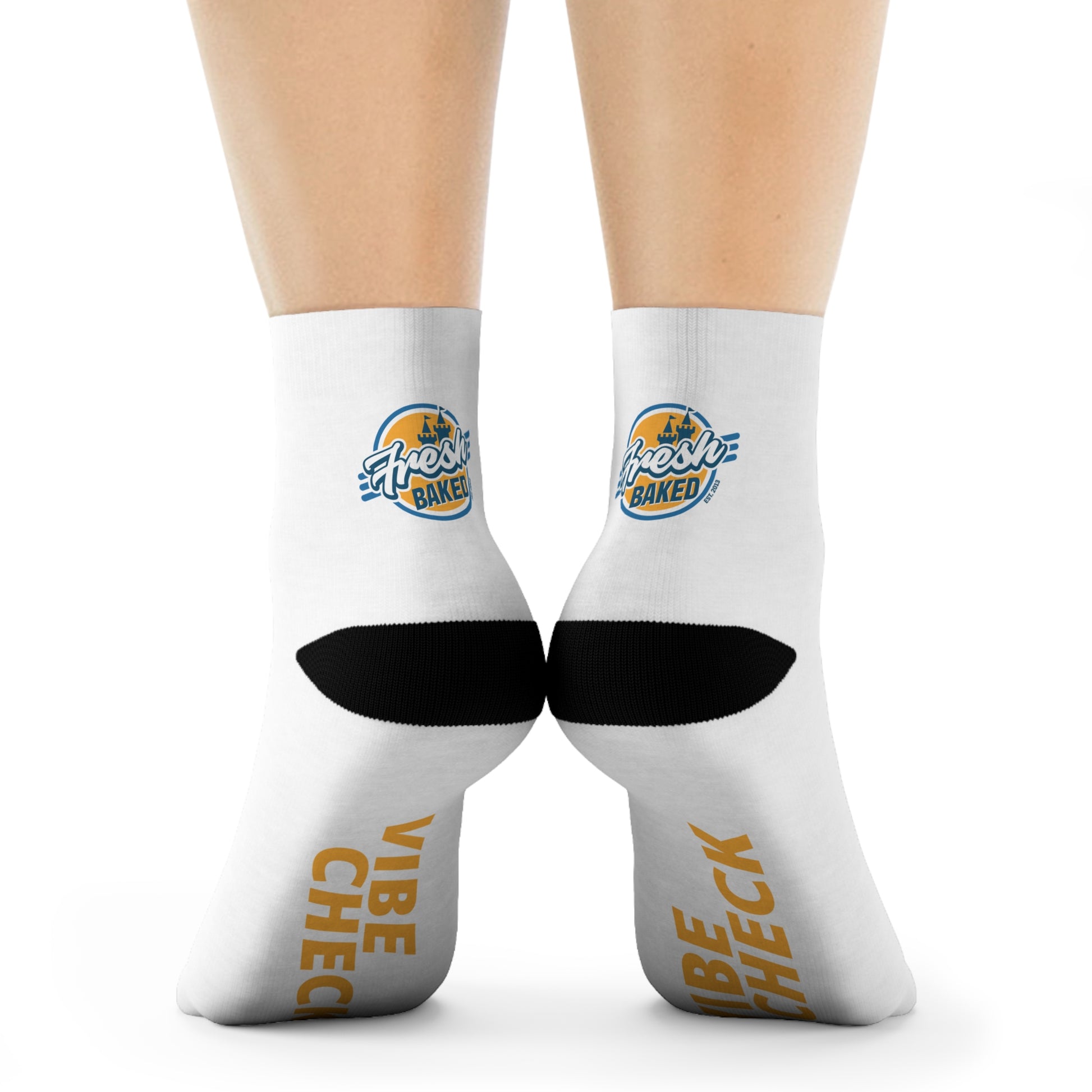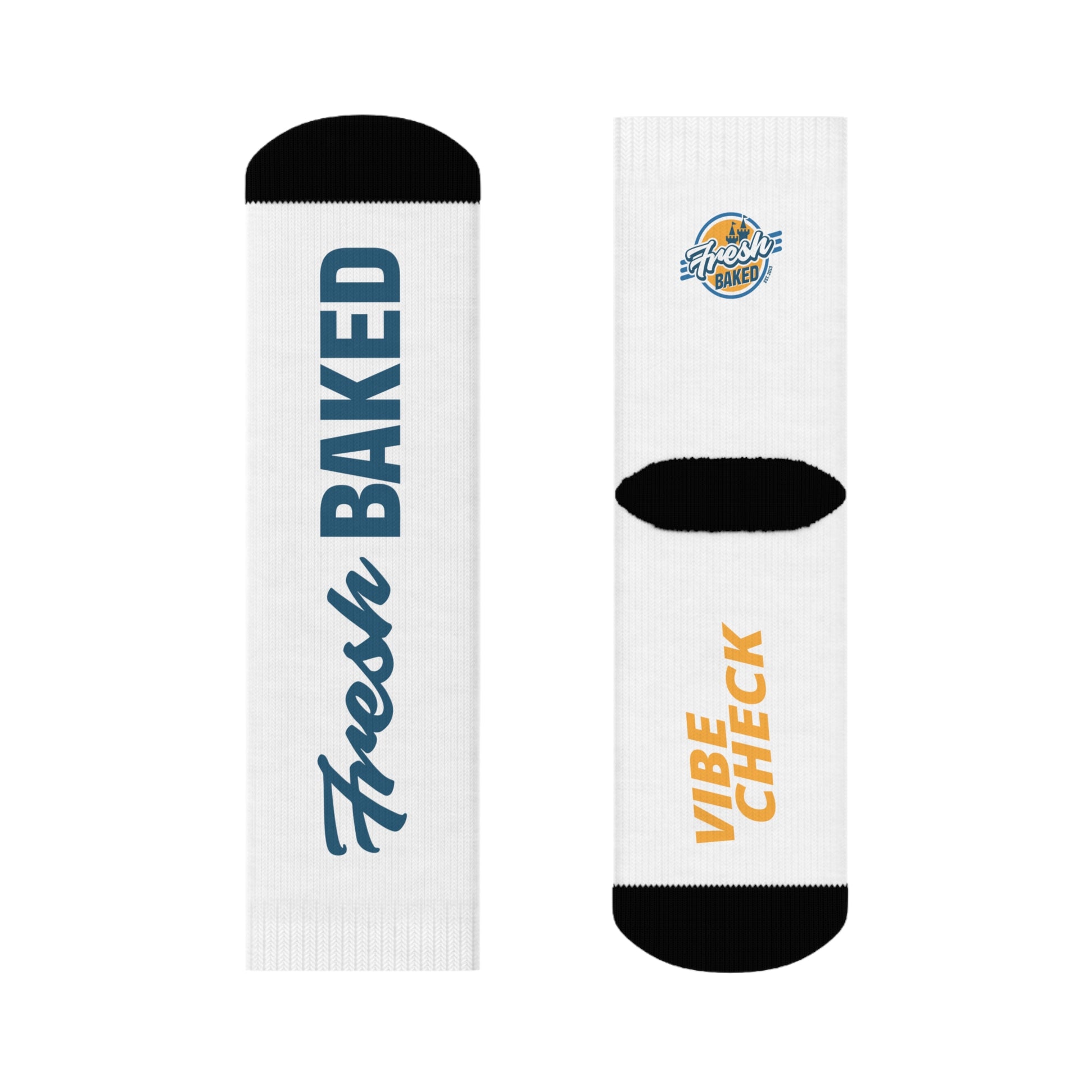 Stay cozy from the ground up with these ultra-comfy crew socks that serve both style and sass. Featuring bold “Fresh BAKED” branding up the side and a cheeky “VIBE CHECK” on the bottom, these socks are built for those who love comfort but aren’t afraid to make a statement. Whether you're strolling through the parks or lounging on the couch, these are your go-to for snug support with personality.