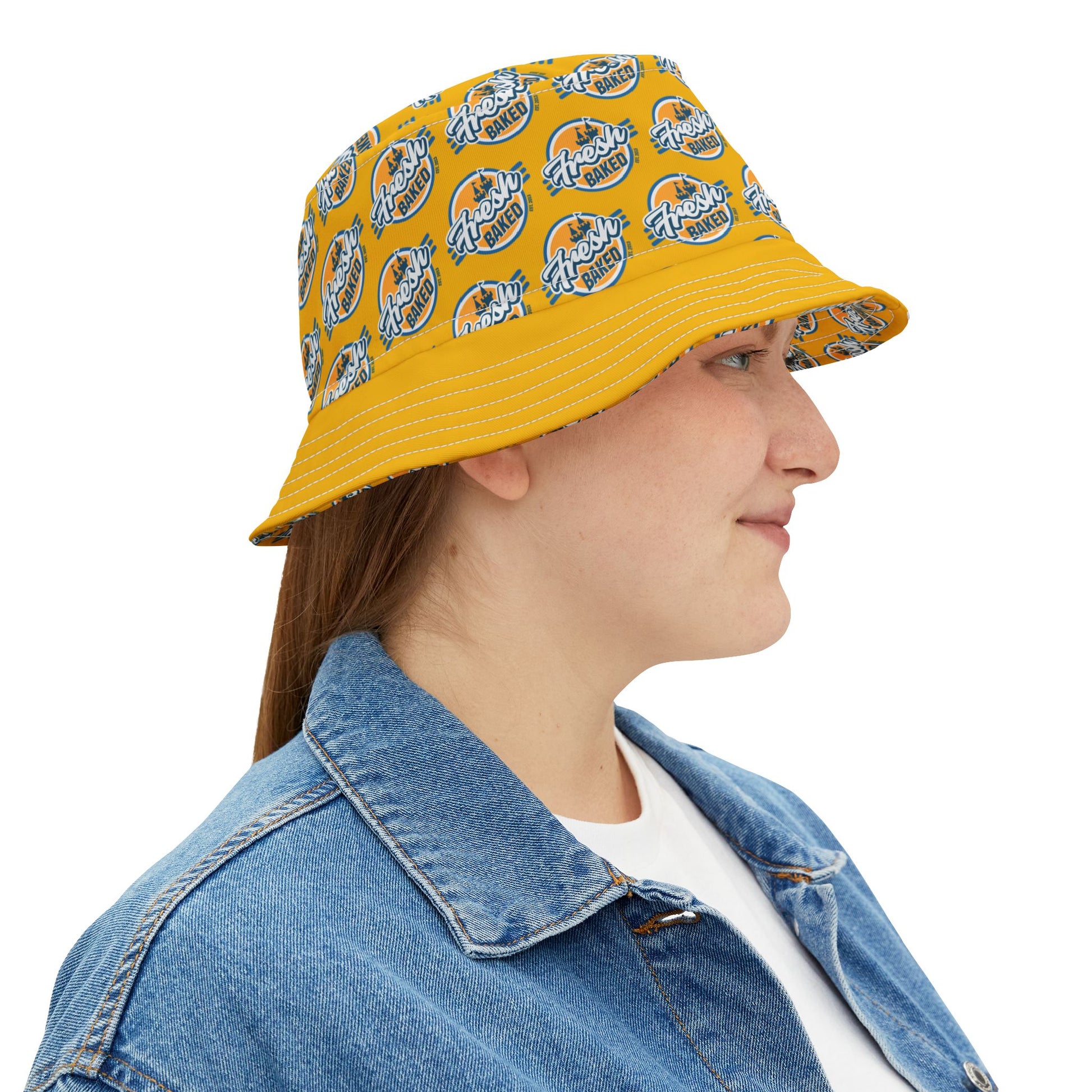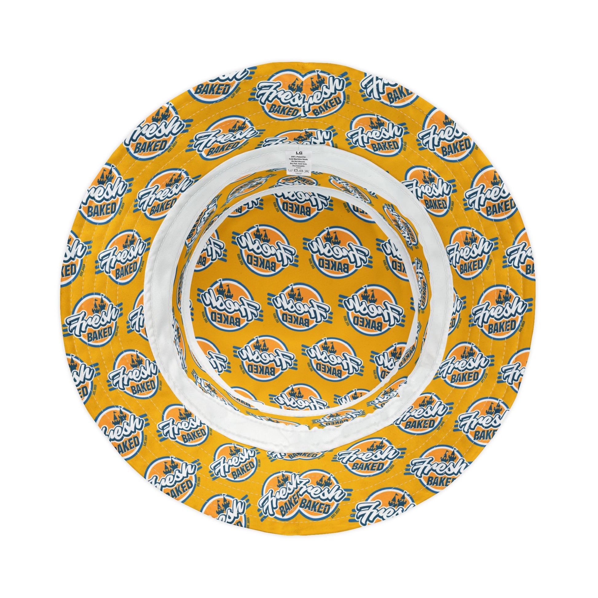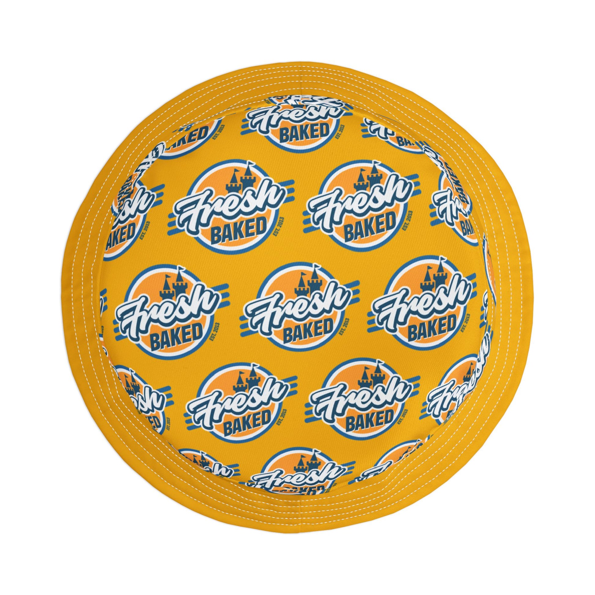 Step into the sunshine and let your style shine with this bright and bold Fresh Baked bucket hat! Wrapped in our signature logo and dressed in golden yellow, this hat is practically glowing with good vibes. Whether you're soaking up rays in the parks, people-watching with a churro in hand, or strolling through your favorite weekend spot, this hat brings the heat—in all the right ways.
