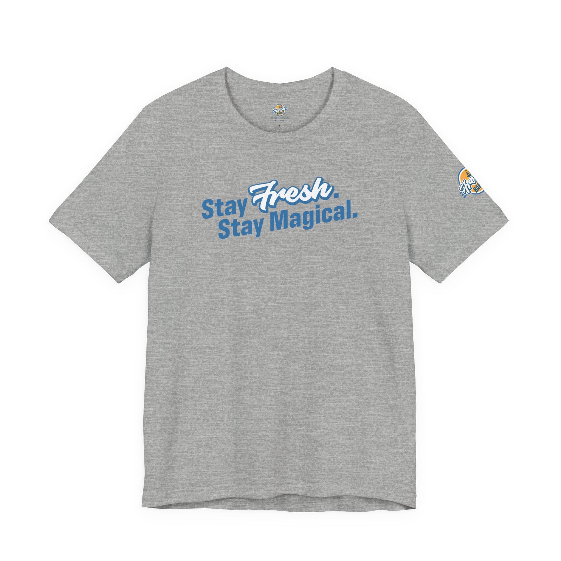 Bring a little pixie dust to your wardrobe with this playful unisex jersey tee. Made from soft cotton and built for comfort, this shirt fits like a favorite from the very first wear. Featuring the phrase “Stay Fresh. Stay Magical.” across the front and a subtle logo on the sleeve, it’s a gentle reminder to keep the wonder alive. Ribbed knit collars and tapered shoulders provide a flattering fit that holds up over time—perfect for park hopping, photo days, or just spreading good vibes wherever you go.