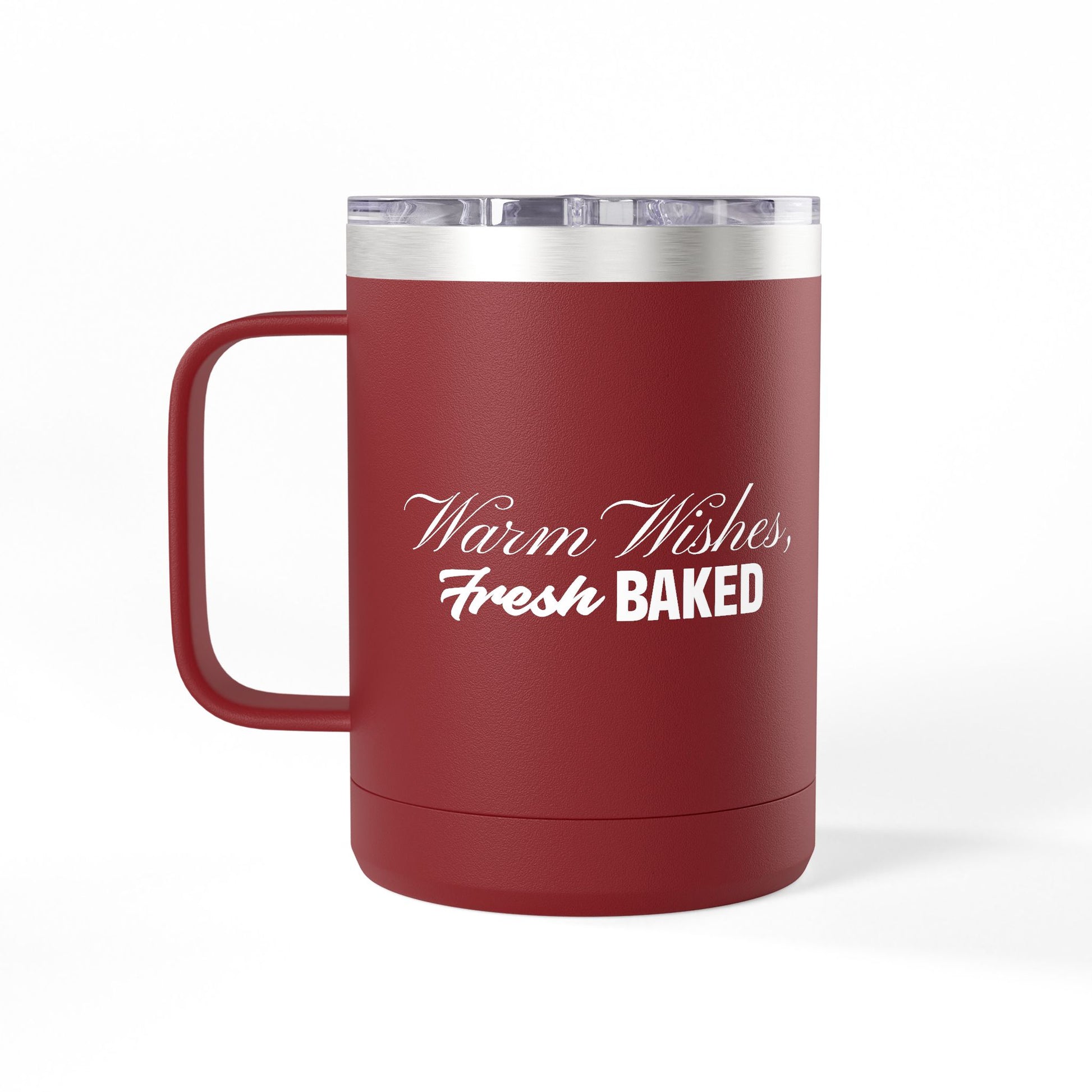 Wrap your hands around a little holiday cheer with this red insulated mug featuring the Fresh Baked Santa hat logo. Its double-wall design keeps drinks hot or cold for hours — perfect for cozy mornings, festive nights, or park adventures on the go.